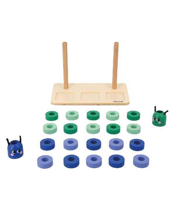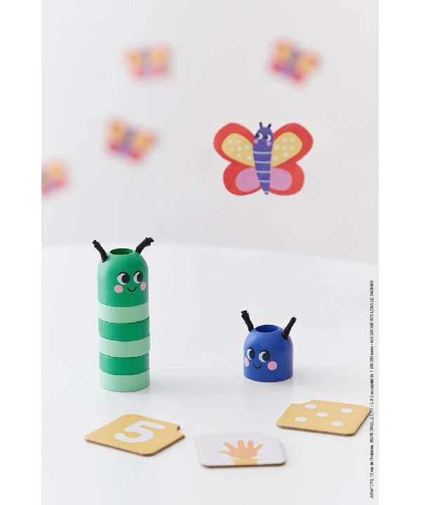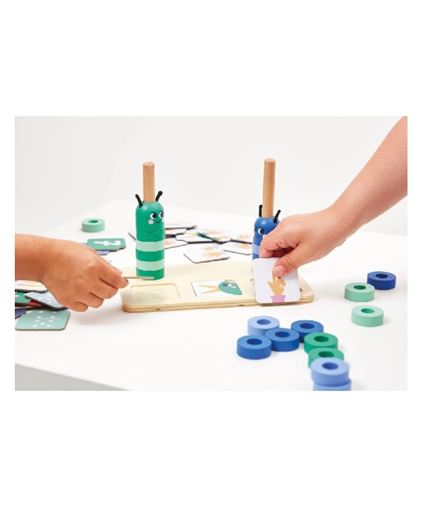 Contiene : un soporte de madera , 10 cuentas verdes , 10 cuentas azules , 2 cabezas de oruga de madera y 33 tarjetas de cartón .