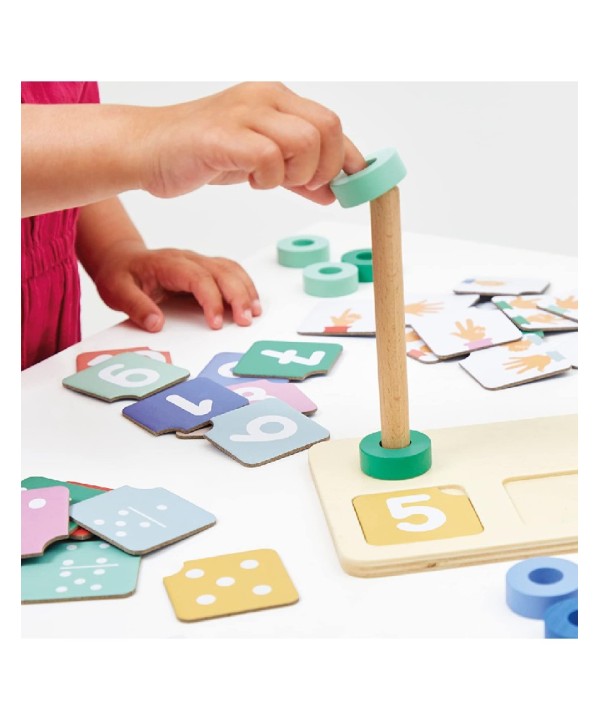 Con este juego los niños aprenderán a identificar un número de diferentes formas : con los dedos de la mano , con los lados de un dado y el número escrito. Luego puede aprender a expresar una cantidad y a componer un número apilando los aros en las varillas . También aprenderá a comparar números usando las 3 tarjetas de signos : menor que .., mayor que .. e igual.